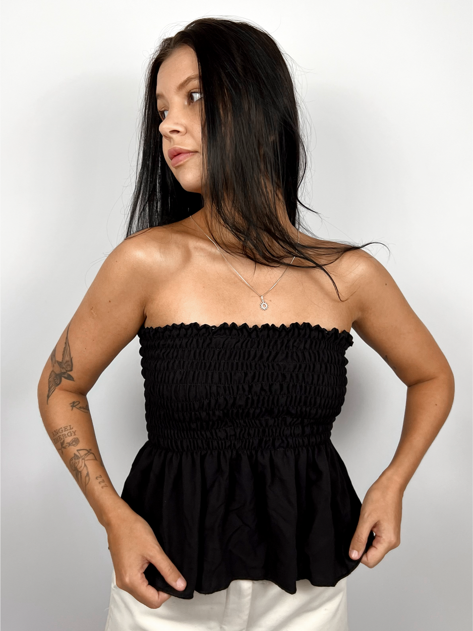 Feito em viscose fresca, o top tomara que caia tem corpo em lastex que se ajusta ao corpo com conforto e segurança. O babado na barra adiciona um toque delicado, enquanto o modelo tamanho único valoriza diferentes silhuetas com leveza e praticidade.